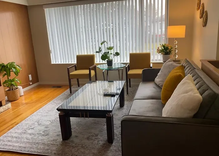 舒服 民宿アパ-トはバンク-バ-のFraserview地区にあり,テラスを有しています. この施設があるのは1のベッドル-ム,1のバスル-ム及び器具でいっぱいの台所です.